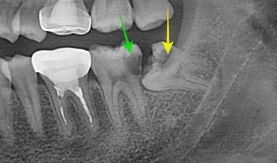 사진 1,2번과 같은 상태가 오랫동안 유지되면 사랑니(노란 화살표) 뿐 아니라 그 앞의 치아까지도(초록 화살표) 충치가 생깁니다.