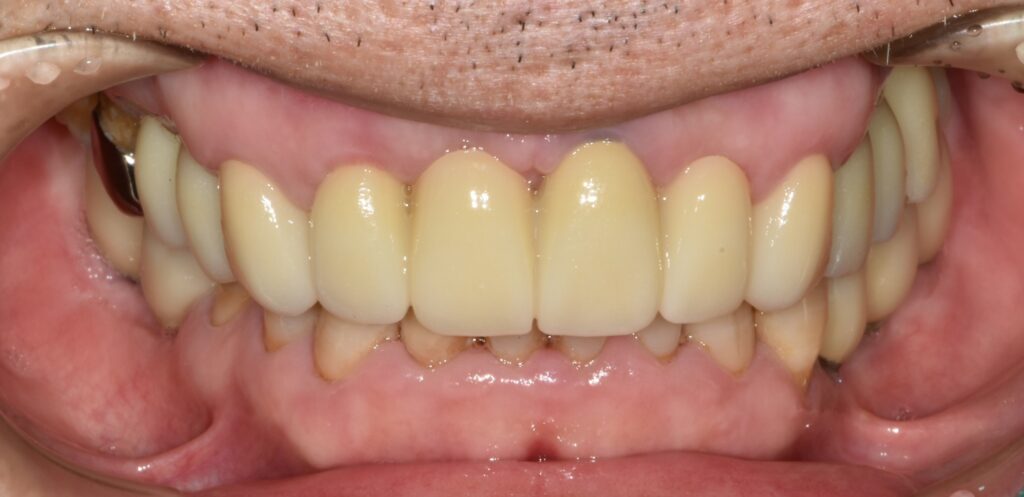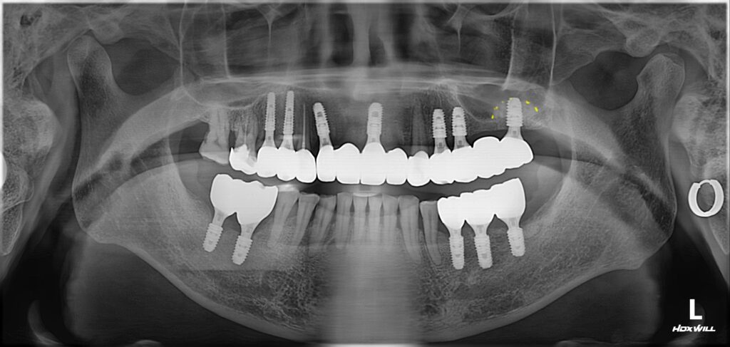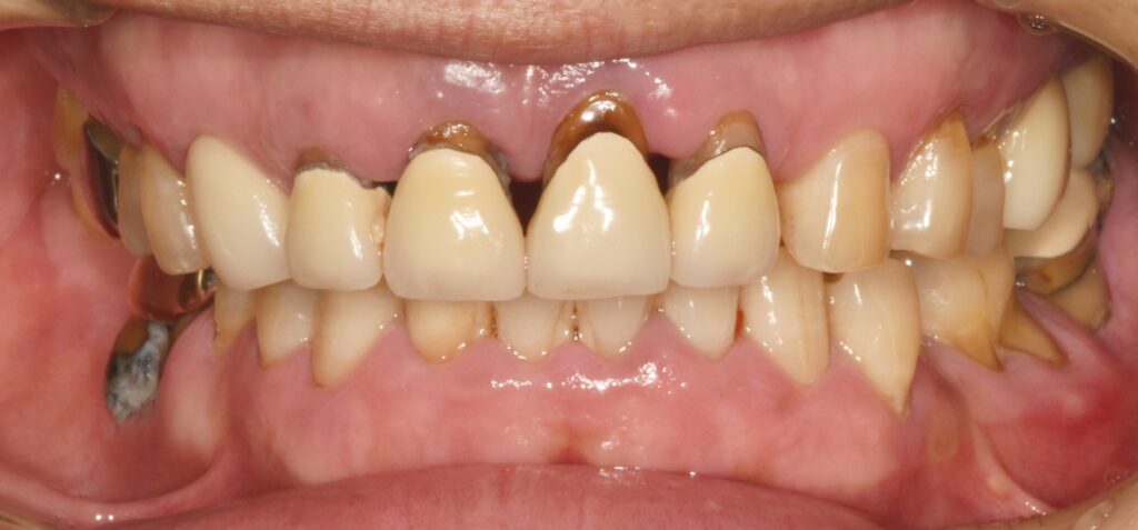 위 환자분은 다수의 어금니와 상악 전치부(위턱 앞니)를 모두 발치하고 임플란트를 식립하였습니다.