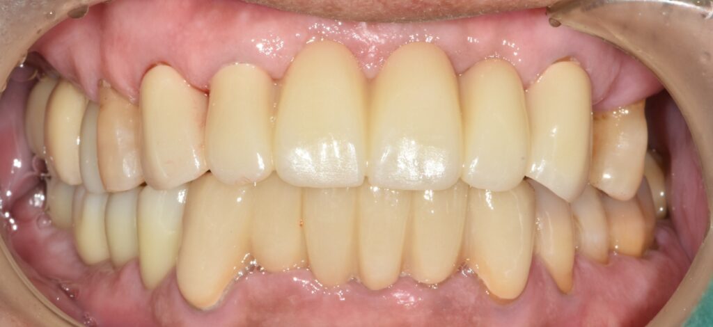 오른쪽 위아래 임플란트 식립한 뒤 임플란트와 뼈가 단단하게 붙는 기간인 2개월여 기간 동안 염증이 생긴 앞니는 발치한 뒤 브릿지로 된 임시치아를 사용하셨습니다.