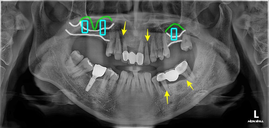 1. 어금니와 앞니 쪽 잇몸 염증이 심해서 치아가 많이 흔들리고 있었습니다. (노란색 화살 표시)