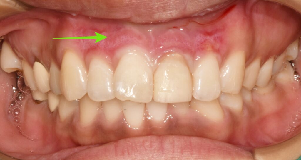 1. 잇몸이 까맣게 보여서 심미적으로 좋지 않습니다. (연두색 화살표)