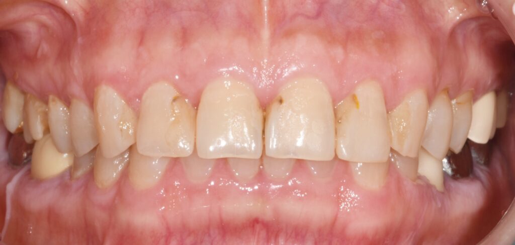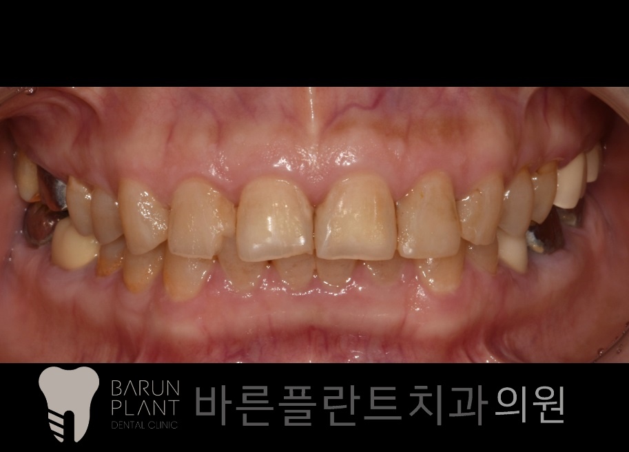 기존에 레진으로 치료하셨던 치아들이 변색도 되고 이차 충치도 생기면서 지저분해 보이는 모습입니다.