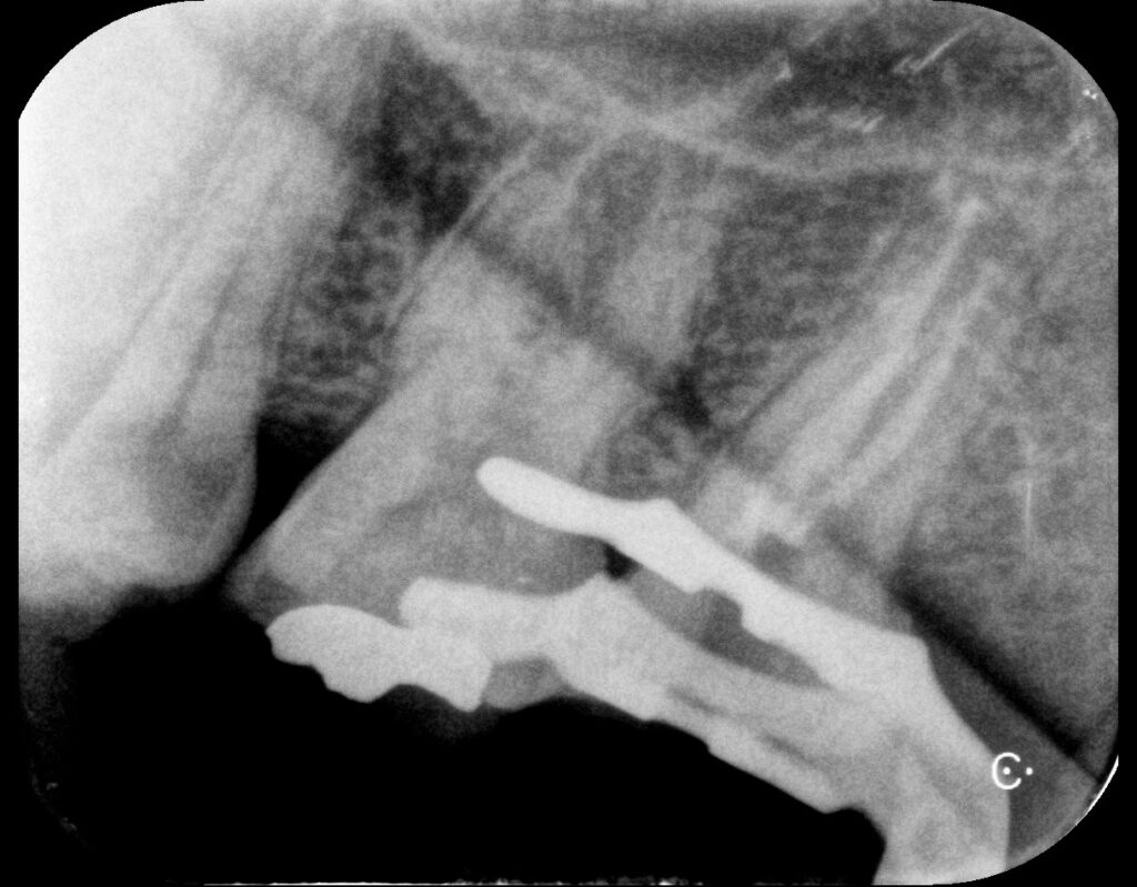 크랙이 치수(신경)까지 침범한 것으로 판단되어 신경치료(근관치료)를 진행했습니다. 방사선 사진에서도 치근 주변 변화가 확인되었어요. 치아 균열이 깊어질수록 세균이 신경까지 침투하기 쉬워지기 때문에 조기 치료가 중요합니다.